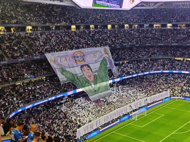 El Nuevo Bernabéu rinde homenaje a Lucas Vázquez con un tifo precioso del joven canterano con la bufanda del Real Madrid de pequeño.