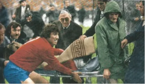 El caos se apodera del banquillo español mientras el estadio termina de entrar en ebullición. Kubala está fuera de sí mientras Juanito, caído a plomo al suelo, recibe las primeras asistencias. El micrófono de José María García no se pierde nada y los suplentes piden explicaciones al árbitro. En medio de otra lluvia de objetos integrantes del banquillo como el bético Sebastián Alabanda, suplente aquel día, junto a varios periodistas que cubrían el partido a pie de campo, sacan del campo en camilla a un aturdido Juanito envuelto en una manta marrón. Es un milagro pero tan solo está conmocionado.